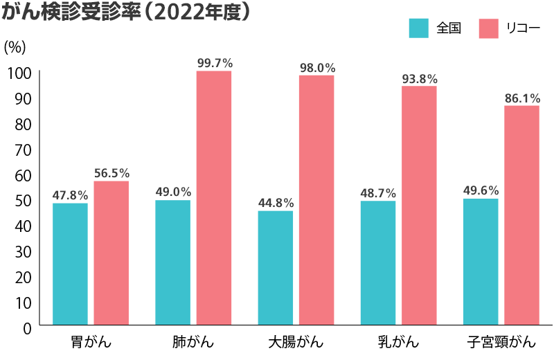 リコーグループでは1970年代より35歳以上を対象に定期健康診断を人間ドックで実施してきましたが,2012年度からは,法定の項目に加えて,生活習慣病の予防とがんの早期発見を目的とした新たな健康診断を実施しており,健康診断受診率は100%となっています。