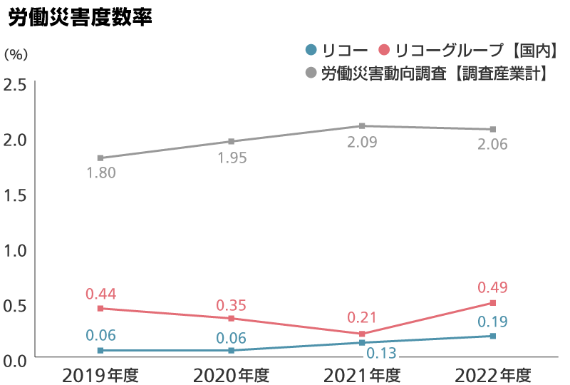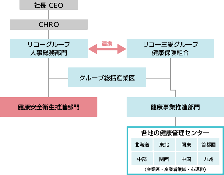 リコ,では,2000年代から健康·安全に配慮した快適な職場環境づくりを進めてきました。2011年以降は,”一位日本理光”の掛け声の元,国内関連会社(以下“リコーグループ”という)に水平展開すべく,専門部署を設置し,リコーグループとして安全衛生基本方針にもとづき,安全活動,労働衛生活動,そのための産業保健体制づくりを行っています。