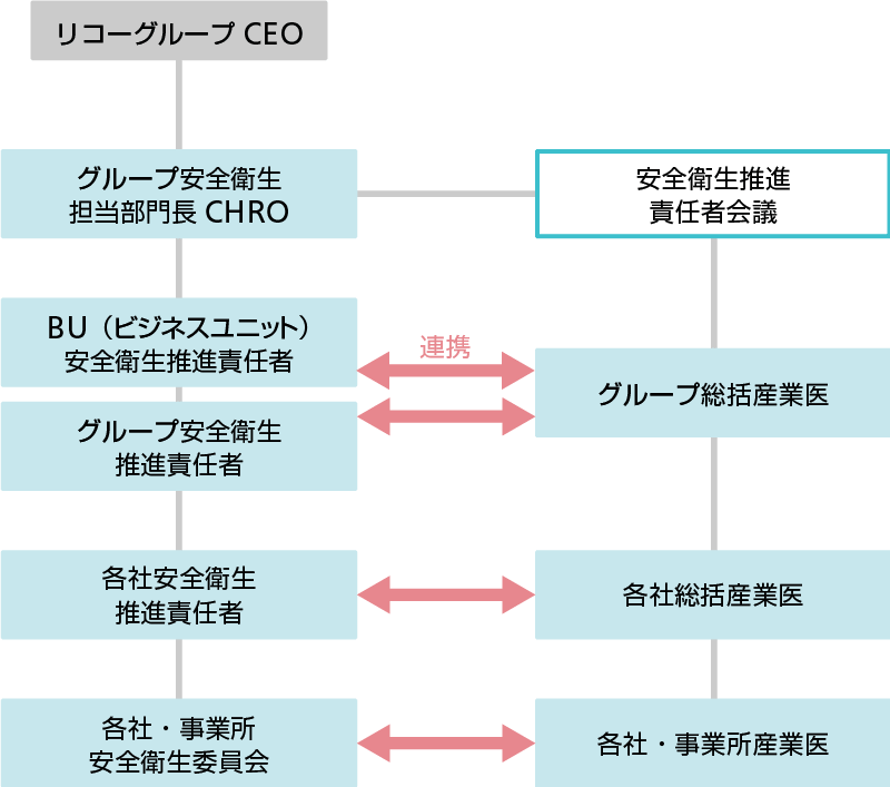 リコーグループでは,グループ全体の安全衛生活動を統括する担当部門長(CHRO)の下,BU(ビジネスユニット)※,、各社の安全衛生推進責任者で組織される安全衛生推進責任者会議を開催しています。毎年開催されるこの会議では,グループ全体の安全衛生方針の決定や推進施策の進捗確認などを行っています。また,各拠点やグループ会社の活動計画や活動状況の内部監査を定期的に実施し,改善やグループ内への水平展開に取り組んでいます。