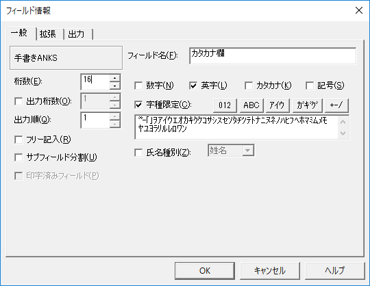 一文字毎の区切りが無い記入欄を,フリー記入あるいはフリーピッチ欄と呼びますが,この形式で読み取り可能な字種は,数字と英大文字および手書き漢字の住所・氏名だけです。また,これらの文字に関しても,読み取り精度は一文字毎に区切りの印刷された固定ピッチに比べて不利になります。